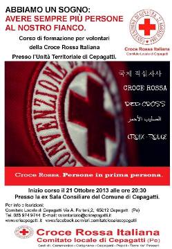 CEPAGATTI (PE) -Il Presidente del Comitato Locale di Cepagatti (Pe),Constantino Camblor ha reso noto che lunedì 21 presso la ex Sala Consiliare del Comune di Cepagatti in via D’Ortenzio verrà presentato il prossimo Corso di formazione per diventare Volontari della Croce Rossa Italiana.Il termine di scadenza per le domande di ammissione è fissato per lunedì 21 ottobre 2013 e ci si può iscrivere anche durante la presentazione del Corso.