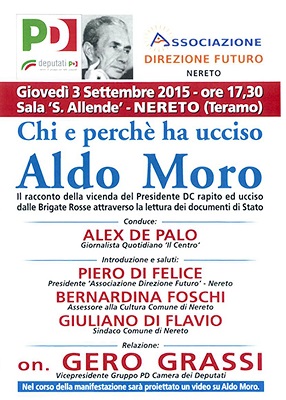 NERETO (TE) – Giovedì 3 settembre, alle ore 17,30, si terrà a Nereto, presso la sala comunale “S. Allende”, il convegno dal titolo “Chi e perché ha ucciso Aldo Moro“, organizzato con la collaborazione dell’Associazione DirezioneFuturo Nereto. La conduzione dell’evento, affidata al giornalista del quotidiano il Centro, Alex De Palo, vedrà, in apertura, gli interventi del Presidente dell’Associazione DirezioneFuturoNereto Piero Di Felice, del Sindaco di Nereto Giuliano Di Flavio e dell’Assessore alla Cultura Berardina Foschi. Relazionerà l’Onorevole Gero Grassi, VicePresidente del gruppo PD alla Camera dei Deputati.