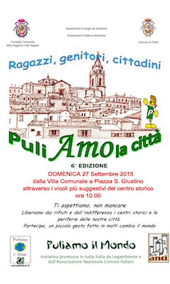 CHIETI – L’Amministrazione Comunale di Chieti ha aderito anche quest’anno alla manifestazione “Puliamo il Mondo 2015” che si svolgerà nelle giornate di venerdì 25, sabato 26 e domenica 27 settembre 2015, in collaborazione con ANCI e Legambiente e con il prezioso contributo del Consiglio Comunale delle Ragazze e dei Ragazzi, coordinato da Carmela Caiani, che ha fortemente sostenuto la partecipazione all’iniziativa