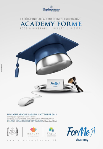 “Academy ForMe” aprirà le porte domani, sabato 1 ottobre 2016, alle ore 16.00, con la presentazione del libro “L’economia del su misura. Artigiani, digitale, innovazione” di Paolo Manfredi. A seguire, una tavola rotonda sul tema “Strumenti e strategie per un nuovo modello artigiano” alla quale parteciperanno, tra gli altri: Luciano Massone, vice Presidente WCM (World Class Manufacturing) gruppo Fiat, e Donato Orlandi, responsabile 3D LAB dei Laboratori Nazionali del Gran Sasso.