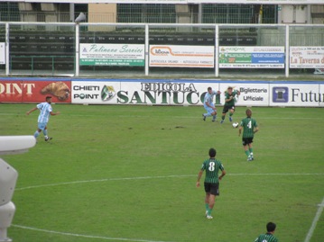 Al 26?sempre lui devia di testa un cross di Malerba spedendo di poco alto. Due minuti più tardi il direttore di gara espelle l’allenatore neroverde Silvio Paolucci per proteste: decisione tutta da rivedere che molti dagli spalti faticano a comprendere. Al 39?Berardino è anticipato dal portiere ospite in uscita e poco dopo Rossi con un gran tiro da fuori lambisce il palo. Il primo tempo si chiude con Lacarra che scheggia la traversa di testa con la complicità di un avversario: fino all’intervallo si è vista una sola squadra in campo, il Chieti.