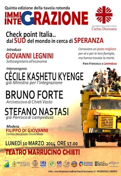 CHIETI – Domani, 7 marzo alle ore 12.00 presso la casa Mater Populi Teatini di Chieti in Via Cesare De Lollis, 54 si terrà una conferenza stampa di presentazione della tavola rotonda del ciclo Immigrazione/Integrazione dal titolo “Check point Italia: dal SUD del mondo in cerca di speranza”, evento che si terrà Lunedì 10 marzo 2014 ore 17.00 presso il Teatro Marrucino, organizzato dalla Caritas Diocesana dell’Arcidiocesi di Chieti\Vasto. Alla tavola rotonda, patrocinata dalla Presidenza del Consiglio della Regione Abruzzo, dall’Ufficio Scolastico Regionale, dal Comune, dalla Provincia, dall’Università “G. D’Annunzio” di Chieti e dal Centro Servizi per il Volontariato della Provincia di Chieti, parteciperanno l’On. Cécile Kashetu Kyenge, esperta d’immigrazione ed ex ministra per l’Integrazione, Padre Bruno Forte, teologo e Arcivescovo di Chieti\Vasto e Don Stefano Nastasi, già parroco di Lampedusa.