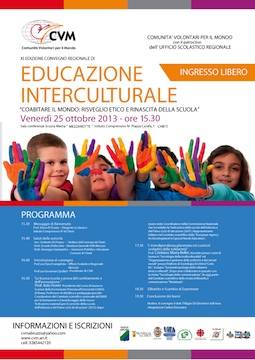 Il convegno, con ingresso gratuito, si terrà il giorno venerdì 25 ottobre 2013 dalle ore 15.30 alle 19.30 presso la sala conferenze della Scuola Media “Mezzanotte” di Chieti Scalo e sarà introdotto come ogni anno dalla Prof.ssa Giovanna Cipollari, Ex tecnico Irre Marche e Responsabile Didattica del Settore ESCI del CVM, da più di 30 anni impegnata nella Ricerca sull’Educazione Interculturale e sulla Revisione dei Testi in Chiave Interculturale.