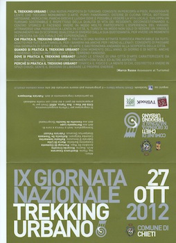 CHIETI – Sabato, 27 ottobre prossimo,si svolgerà anche a Chieti la nona edizione della Giornata Nazionale del Trekking Urbano a cui aderiranno oltre 30 città, fra cui : Siena, Bari, Bologna, Cagliari, Mantova, Napoli, Padova, Roma, Salerno, Spoleto, Trento, Urbino, Venezia .Tali città sono presenti, con Chieti, nel materiale distribuito a livello nazionale per promuovere l’originale iniziativa di turismo ecologico caratterizzato dal connubio sport – cultura. Cittadini, turisti e visitatori potranno scegliere tra i tanti itinerari proposti dalle amministrazioni comunali e camminare per le vie delle città alla riscoperta degli angoli più belli e dei monumenti d’arte meno noti.