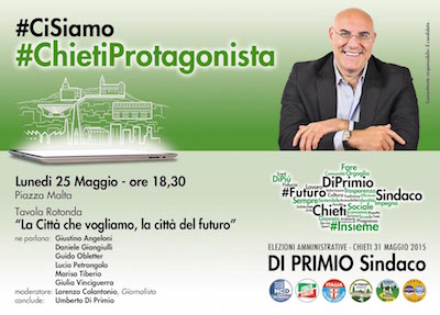 CHIETI – Lunedì prossimo, 25 maggio alle ore 18.30 in Piazza Malta, a Chieti si terrà un incontro pubblico del Sindaco Umberto Di Primio. Saranno presenti i rappresentanti dei partiti e delle liste della coalizione in appoggio alla ricandidatura a sindaco di Umberto Di Primio ed esponenti dell’associazionismo e del mondo sindacale.