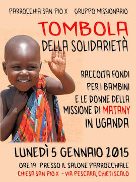 CHIETI – Lunedì 5 gennaio alle ore 19 presso il salone parrocchiale della Chiesa San Pio X in via Pescara a Chieti Scalo, ci sarà l’appuntamento con la “Tombola della solidarietà”. Organizzato dal gruppo missionario della Parrocchia di San Pio X, l’iniziativa nasce per sostenere il progetto missionario 2014\2015 della parrocchia. Il progetto di quest’anno è denominato Progetto Matany ed è dedicato ai bambini e le donne di Suor Rosaria Marrone, missionaria abruzzese in Africa da oltre 40 anni. L’Uganda è uno dei paesi più poveri dell’Africa. Per ricevere ulteriori informazioni è possibile contattare Valentina al 329/7430660