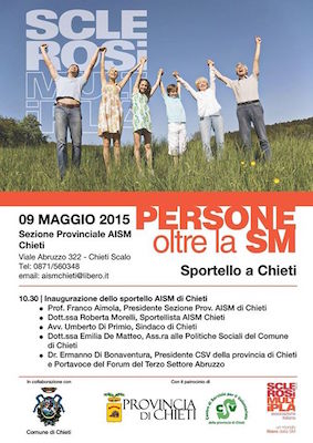 CHIETI – Sabato 9 maggio alle ore 10.30, presso la Sezione Provinciale di Chieti in viale Abruzzo 322 a Chieti Scalo, si terrà l’inaugurazione dello Sportello AISM. All’iniziativa, organizzata in collaborazione col Comune di Chieti, interverranno, oltre al Prof. Franco Aimola, Presidente Provinciale di Chieti, e alla Dr.ssa Roberta Morelli, Sportellista Provinciale di Chieti, l’Avv. Umberto di Primio, Sindaco del Comune di Chieti, la Dr.ssa Emilia De Matteo, Ass.ra alle Politiche Sociali del Comune di Chieti, e il Dr. Ermanno Di Bonaventura, Presidente del CSV della provincia di Chieti e Portavoce del Forum del Terzo Settore Abruzzo.