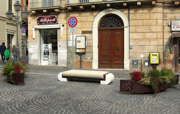 7 fioriere metalliche collocate in piazza Vico (due), all’angolo del palazzo ex Upim (una) e ai lati delle panchine sofà davanti ai palazzi gemelli (quattro).