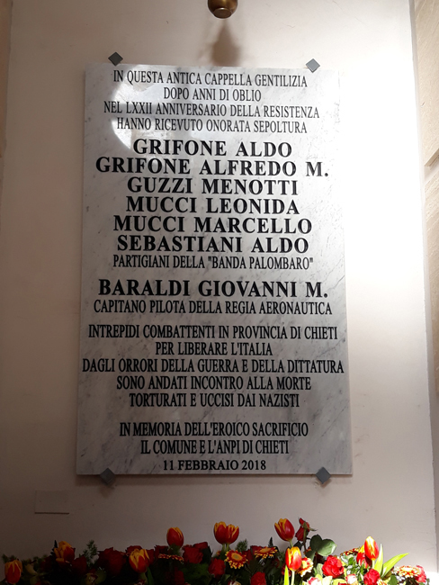CHIETI – Il Sindaco di Chieti, Umberto Di Primio, questa mattina, presso il Cimitero comunale, alla presenza dei rappresentanti dell’A.N.P.I. “Alfredo Grifone”, delle associazioni combattentistiche e dei parenti dei giovani martiri della Banda Palombaro, che nel periodo bellico dell’occupazione tedesca seguita all’armistizio dell’8 settembre 1943 furono fatti prigionieri e poi fucilati dai militari tedeschi, ha partecipato alla commemorazione dei caduti le cui spoglie sono state traslate all’interno della Cappella Taraborrelli, di proprietà comunale, che, dopo i lavori di straordinaria manutenzione fatti eseguire dall’Amministrazione comunale, è tornata ad ospitare Alfredo e Aldo Grifone, Menotti Guzzi, Leonida Mucci, Marcello Mucci, Aldo Sebastiani e il capitano della Regia Aviazione Militare, Giovanni Baraldi, divenendo il Sacrario dei Combattenti della Resistenza teatina a perenne ricordo del loro sacrificio.