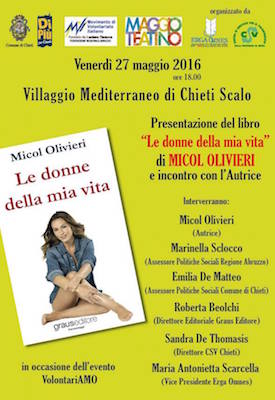 CHIETI – Venerdì 27 maggio, alle ore 18, al Villaggio Mediterraneo di Chieti Scalo, in occasione dell’evento “VolontariAMO” Musica, animazione e cultura per la solidarietà, ad ingresso libero, organizzato dal Csv di Chieti, dall’Associazione di volontariato onlus Erga Omnes e dal Comune di Chieti, evento del maggio teatino, Micol Olivieri (Alice nella fiction “I Cesaroni”) presenterà in anteprima il suo libro (edito da Graus Editore).
