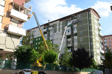I lavori in corso di esecuzione riguardano interventi di ripristino delle lesioni alle tamponature e tramezzi, demolizione di pavimenti e massetti dei balconi e rifacimento degli stessi, sistemazione delle facciate con riprofilatura dei frontalini e parapetti balconi, raschiatura del rivestimento plastico esistente con ritinteggiatura esterna con pitture a base di silicati di potassio (tinteggiatura ecologica e traspirante) e tinteggiatura degli interni degli alloggi, del porticato e delle scale.Tutti gli interventi in corso di esecuzione, comunque, non interessano le parti strutturali degli edifici in quanto, come già verificato all’indomani del sisma, non hanno ricevuto danni ed hanno risposto in maniera adeguata alle sollecitazioni del sisma.Entro due mesi i lavori saranno completati restituendo ai residenti ed all’intera comunità teatina cinque palazzine perfettamente ristrutturate».