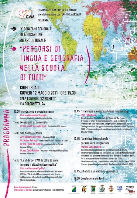 In merito a tale tematica La COMUNITA’ VOLONTARI PER IL MONDO CVM in collaborazione con EX-IRRE ABRUZZO, presenta il IX CONVEGNO REGIONALE DI EDUCAZIONE INTERCULTURALE che si terrà Giovedì 12 maggio 2011,alle ore 15.30, presso la Sala Convegni “Carichieti” Chieti Scalo.