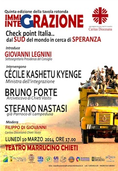 CHIETI – La Caritas Diocesana di ChietiVasto presenta la quinta edizione della tavola rotonda IMMIGRAZIONE/INTEGRAZIONE dal titolo “Check point Italia: dal SUD del mondo in cerca di speranza”,che si terrà lunedì 10 marzo 2014 alle ore 17.00 presso il Teatro Marrucino – Chieti.Ospiti d’eccezione saranno l’ON. CÉCILE KASHETU KYENGE, Ministra per l’Integrazione, PADRE BRUNO FORTE, teologo e Arcivescovo di ChietiVasto e DON STEFANO NASTASI, già parroco di Lampedusa.