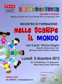 CHIETI – Oggi, 9 dicembre 2013 , alle ore 15.00 presso la Biblioteca Scuola “Mezzanotte” in Piazza Carafa, 1 a Chieti Scalo,la Coop Adriatica in collaborazione con CVM – Comunità Volontari per il Mondo e l’Istituto Comprensivo IV di Chieti propone, in occasione della mostra interculturale dal titolo “Nei libri il mondo”, un incontro di formazione per docenti, educatori e genitori con il prof. Vinicio Ongini, esperto del MIUR .
