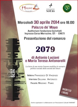 CHIETI – Dopo il successo della prima presentazione avvenuta a Francavilla al Mare lo scorso 15 Marzo, gli autori del romanzo “2079” Antonio Luciani e Maria Teresa Antonarelli, incontrano la cittadinanza di Chieti.