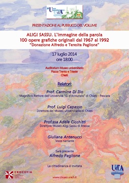 all’autunno prossimo, le cento opere grafiche originali realizzate da Sassu tra il 1967 e il 1992 saranno collocate nel Centro di Eccellenza per lo Studio dell’Invecchiamento (Ce.S.I.), ma già dal 17 luglio 2014, anniversario della nascita e della morte di Sassu, due selezioni saranno visibili nel Museo Universitario e nella sala consiliare dell’ateneo. Per l’occasione, giovedì 17 luglio ci sarà la presentazione del volume che racchiude le cento opere, in un incontro all’auditorium del Museo universitario in piazza Trento e Trieste a Chieti, con inizio alle ore 18.00. Interverranno Carmine Di Ilio, rettore della d’Annunzio, Luigi Capasso, direttore del Museo universitario, e Adele Cicchitti, direttrice del Museo Sassu di Atessa e autrice del testo critico del volume; l’attrice Giuliana Antenucci reciterà alcune poesie composte da Sassu. Sarà presente Alfredo Paglione.