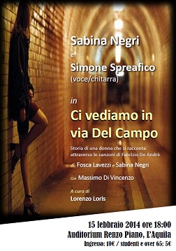 La musica di De André risuonerà in una rivisitazione pseudoteatrale. Interpretato da Sabina Negri e da Simone Spreafico ( voce e chitarra) – con Massimo Di Vincenzo, a cura di Lorenzo Loris e Fosca Lavezzi – l’incontro sarà un’occasione per riflettere insieme sulla piaga dilagante del femminicidio e sulla violenza di genere, oltre ad essere un omaggio a De André in occasione del giorno del suo compleanno e un ringraziamento al figlio Cristiano per il forte sostegno ai principi del Movimento Cinque Stelle.