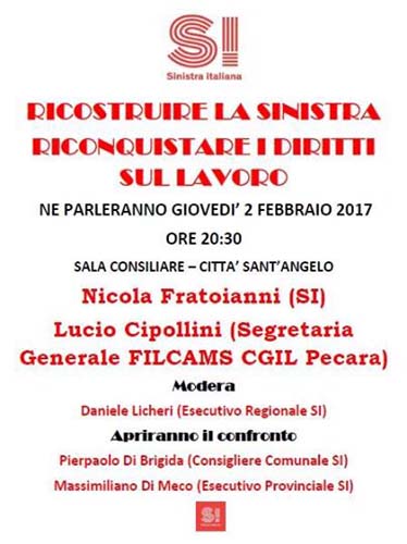 CITTA’ SANT’ANGELO (PE) – Giovedì 2 Febbraio alle ore 20.30, nella sala consiliare del Comune di Città Sant’Angelo , avrà luogo un incontro-dibattito con il deputato di Sinistra Italiana Nicola Fratoianni e il segretario generale della Filcams Cgil Pescara Lucio Cipollini.