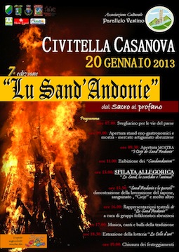 CIVITELLA CASANOVA(PE) – Domenica, 20 gennaio 2013 si terrà a Civitella Casanova la settima edizione di Lu Sand’Andonie – dal Sacro al Profano, un evento straordinario, ideato e portato avanti dall’Associazione culturale Parallelo Vestino, per riscoprire il fascino delle tradizioni popolari agresti, tuffarsi in un universo di sapori incomparabili e farsi trasportare dall’allegria e dal ritmo della musica folk.