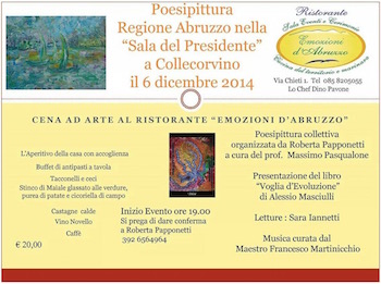 COLLECORVINO (PE) – La Poesipittura fa tappa a Collecorvino – Ristorante Emozioni d’Abruzzo gestito da Dino Pavone. L’evento avrà luogo il giorno 6 dicembre alle ore 19 ed è organizzato dalla pittrice Roberta Papponetti, responsabile della Poesipittura Regione Abruzzo e dal critico d’arte, Massimo Pasqualone. La serata sarà caratterizzata da una cena ad arte. Con la letture di versi e la presentazione del libro di Alessio Masciulli, ci sarà la Collettiva di Poesipittura con artisti noti come Roberta Papponetti, Roberto Di Giampaolo, Bruno Paglialonga, Lucio Monaco, Teresa Michetti, stella Cilli, Ada Di lello, Paola Silvestri, Angela di Teodoro, Vincenzo Petruccielli. Le letture saranno affidate a Sarà Iannetti attrice. La serata sarà caratterizzata dalla presenza del maestro Francesco Martinicchio.