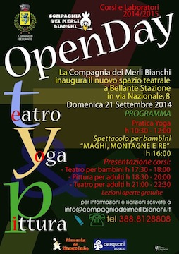 Sabato 28 settembre la Compagnia dei Merli Bianchi sarà invece a Giulianova per il secondo Open Day agli Istituti Catrorani/De Amicis in via Cavour 4 (dietro la sede del Comune). Dalle 9.30 alle 10.30 ci sarà la presentazione dei corsi di yoga (lezioni a Giulianova il martedì dalle 21 alle 22.30), poi dalle 10.30 alle 12 sarà la volta dei laboratori teatrali per adulti (lezioni il giovedì dalle 21 alle 22.30). Nel pomeriggio, dalle 15.30 alle 17, si proseguirà con la presentazione dei laboratori per bambini e adolescenti (lezioni il mercoledì e giovedì a seconda del livello di appartenenza) e dalle 17.30 alle 19 delle lezioni di pittura che si svolgeranno a partire da ottobre ogni mercoledì dalle 17.30 alle 20.