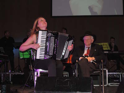 Quindi il ricordo dell’incontro con il Presidente dell’Argentina Peròn e la moglie Evita, e sullo schermo è apparsa la stessa Pavone che interpretava ‘Dont’ Cry for me Argentina’, che ha commosso Teddy Reno. “Sono stato un talent scout – ha detto Reno al pubblico – e per questo oggi scommetto sul futuro di Elisa Riccitelli”, alla quale ha lasciato il palco da solista, per poi cedere lo spazio a Sylvia Pagni, diplomata al Conservatorio ‘Santa Cecilia’ di Roma, reduce dalla Scala di Milano dove, in passato, ha accompagnato artisti del calibro di José Carreras, Placido Domingo e Pavarotti, oggi titolare della Sylvia Pagny Music Center a Pineto, che ha interpretato brani di musica classica da lei stessa riarrangiati in chiave moderna, per poi imbracciare la fisarmonica tra gli applausi dei presenti. Sul palco sono poi saliti alcuni dei bambini del Coro di Scerni di Pineto che, con il Trio-Tregenerazionale, hanno interpretato il brano ‘Uno Come Noi’, dedicata a Papa Francesco e cantata in piazza San Pietro, in sua presenza, in occasione del suo settantanovesimo compleanno.