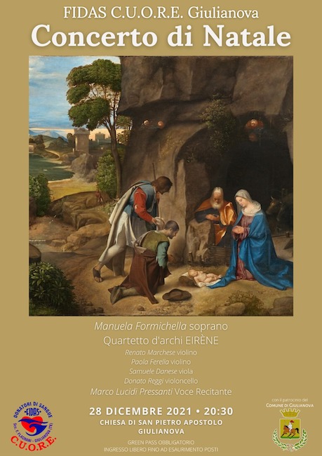 GIULIANOVA – Promuovere le donazioni, non di soldi ma di sangue. Con questo obiettivo, si terrà domani sera, dalle 20.30, il “Concerto di Natale”, evento organizzato dalla Fidas Cuore con il patrocinio del Comune di Giulianova. Ospiterà il concerto la chiesa di San Pietro Apostolo, in piazza Papa Giovanni XXIII. Ad esibirsi, il “soprano brillante” Manuela Formichella, docente di canto lirico al Conservatorio “D’Annunzio” di Pescara, ed il quartetto d’archi “Eirène” composto da Renato Marchese e Paola Ferella (violini), Samuele Danese (viola) e Donato Reggi (violoncello).