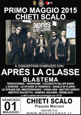 La chiusura del “Concertone d’Abruzzo”, che sarà presentato come di consueto da Emanuele La Plebe, direttore artistico dell’evento, sarà affidata ai Blastema, la rock band romagnola, quarta classificata al Festival di Sanremo nel 2013, nella sezione “Giovani”, con il brano “Dietro l’intima ragione”. A seguire il dub-electro rock degli Après La Classe, il gruppo salentino che farà ballare piazzale Marconi col ritmo coinvolgente dei suoi più grandi successi.