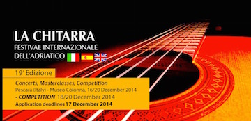 PESCARA – Si terrà nel mese di dicembre, precisamente dal 18 al 20, presso il Museo Colonna di Pescara, il concorso per chitarra, “Festival Internazionale dell’Adriatico”. L’organizzazione ha fissato per il 17 dicembre la scadenza per poter mandare la domanda di iscrizione. I riferimenti è possibile trovarli sul sito ufficiale della manifestazione, www.andressegovia.it (dove è presente il regolamento integrale e le quote di iscrizione) ed è possibile scrivere alla seguente mail: info@andressegovia.it o chiamare al 330760091.