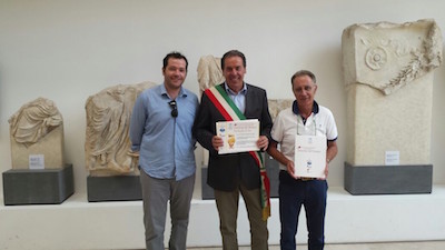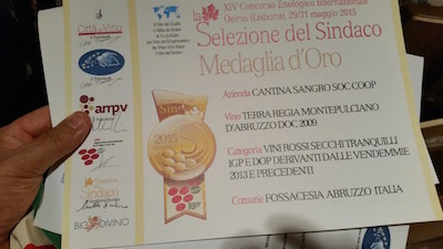 ROMA – Il vino Terra Regia Montepulciano annata 2009, prodotto dalla Cantina Sangro di Fossacesia è stato premiato questa mattina a Roma presso il Museo dell’Ara Pacis con la medaglia d’oro per il concorso enologico internazionale “Selezione del Sindaco 2015”. Presenti alla premiazione il Sindaco di Fossacesia, Enrico Di Giuseppantonio e il Consigliere alle Politiche Agricole ed alle città di identità Lorenzo Santomero ed il Presidente della Cantina Sociale Sangro, Rocco Romano.