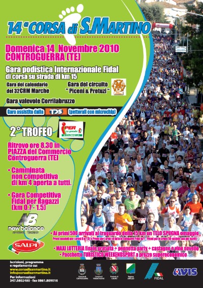 CONTROGUERRA (TE) – Si svolgerà oggi, 14 novembre, la 14ma edizione della Corsa Podistica di San Martino a Controguerra. La manifestazione, che ogni anno cresce nel numero dei partecipanti e nella visibilità tra gli eventi del suo genere, si ripresenta nell’edizione 2010 con alcune novità e si prefigge l’intento di coinvolgere atleti di diverse categorie. Infatti la gara è così articolata :