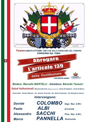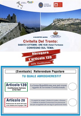 TERAMO – La Presidenza Regionale e la Federazione di Teramo dell’U.M.I. (Unione Monarchica Italiana) organizzano nella giornata di sabato 3 ottobre 2015, nelle località di Teramo e di Civitella del Tronto, un Convegno dal tema “Abroghiamo l’articolo 139 della Costituzione”.
