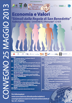 CHIETI – Sabato prossimo, 25 maggio, presso l’università di Chieti, l’Associazione Culturale San Benedetto ha organizzato un importante convegno dal titolo: “Economia e Valori: stimoli dalla Regola di San Benedetto”. L’appuntamento nasce con l’intento di far conoscere il prezioso contributo che ancora oggi può dare la tradizione benedettina all’organizzazione dell’impresa economica, alla gestione delle risorse umane e alla visione stessa del “fare economia”.