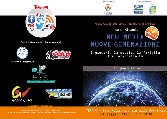 TERAMO – Come ormai da dodici anni, torna puntualmente a Maggio l’appuntamento con gli incontri di studio “New Media, New Generation • I Giovani, la Scuola, la Famiglia tra internet e tv”, appuntamento in cui si parlerà di Cyberbullismo.
