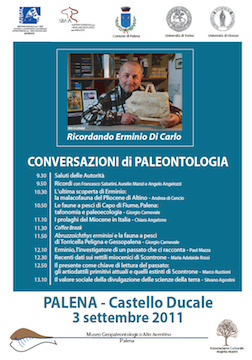 L’incontro è stato fortemente voluto per ricordare Erminio Di Carlo, uomo che ha dedicato una vita alla sua enorme passione per la storia geologica del territorio abruzzese: sarà l’occasione per far conoscere a tutti la sua attività di cultore della geopaleontologia che ha così fortemente contribuito alla crescita della ricerca nel campo. Da ricordare che Di Carlo è stato anche presidente dell’Associazione Culturale Majella e gestore del Museo Geopaleontologico Alto Aventino.