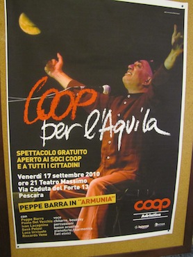 PESCARA – Venerdì, 17 settembre, al Teatro Massimo di Pescara sarà di scena la prima assoluta della stagione dell’Atam con lo spettacolo gratuito di Beppe Barra.E’ un nuovo progetto a favore di L’Aquila promosso da Coop e che ben si accompagna allo spirito che anima le iniziative promosse in tal senso dalla amministrazione comunale di Pescara.