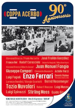 Verranno distribuite le cartoline commemorative dedicate a “Coppa Acerbo novantesimo anniversario” stampate dal Comune di Pescara. Il secondo appuntamento invece è previsto il 22 agosto 2014 alle ore 21.15 presso l’Aurum di Pescara, nell’ambito di Musicarte nel Parco, con un concerto. Verrà proiettato un video realizzato dalla Soprintendenza archivistica e dall’Arch. Antonio Di Loreto. Prenderà parte all’appuntamento la sig.ra Anna Fangio, nipote del pilota argentino Juan Manuel Fangio.