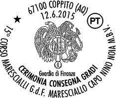 L’annullo recherà la seguente legenda: “67100 COPPITO (AQ) – 12.6.2015 – 15° CORSO MARESCIALLI G.d.F. MARESCIALLO CAPO NINO NOIA M.B.V. – CERIMONIA CONSEGNA GRADI – GUARDIA DI FINANZA” e rappresenterà lo stemma della compagnia con l’aquila e il leone.