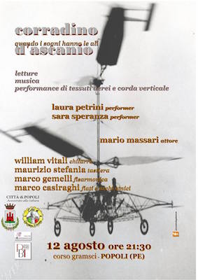 “Quest’anno, più che sulla figura di Corradino D’Ascanio, lo spettacolo si baserà sulla lettura di poesie e brani estratti da testi narrativi inerenti il volo e l’emozione del volo, che leggerò io stesso” – spiega Mario Massari. “A corollario di tutto ciò verranno eseguite performance di tessuti aerei e corda verticale realizzate da Laura Petrini e Sara Speranza, accompagnate da musiche arrangiate ed eseguite al pianoforte dal Maestro Maurizio Stefanìa, che si esibirà insieme a Marco Gemelli alla fisarmonica, William Vitali alle chitarre e Marco Casiraghi ai fiati e archi etnici”.