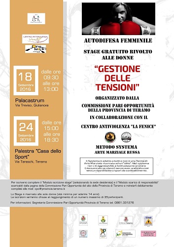 TERAMO – Sono aperte a tutte le donne e alle ragazze della provincia di Teramo con età superiore ai 14 anni le iscrizioni agli stage di autodifesa personale femminile organizzati dalla Commissione Pari Opportunità della Provincia di Teramo in collaborazione con il Centro antiviolenza “La Fenice”.