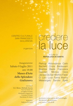 GIULIANOVA (TE) – Sabato 2 luglio alle ore 19.00, presso il Museo d’Arte dello Splendore a Giulianova, ci sarà l’inaugurazione della mostra “Credere la luce Per una nuova iconografia della Madonna dello Splendore”. Verranno esposte 11 opere realizzate da artisti che nei mesi di gennaio e febbraio scorso hanno preso parte ad un corso di arte sacra dal titolo: “Per una nuova iconografia della Madonna dello Splendore”. Questi i nomi degli artisti che espongono: Pierluigi Abbondanza, Carlo Bachetti, Cinzia Baldassarri, Beatrice Basile, Francesca Casolani, Monica Cece, Jacopo Da San Martino, Fabio Di Lizio, Luca Farina, Marino Melarangelo, Sandra Spelli.