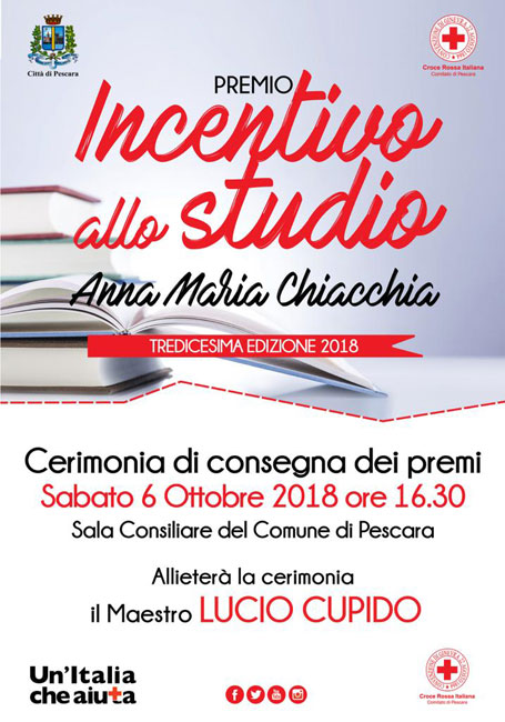 PESCARA – Per la tredicesima edizione del Premio “Incentivo allo studio” dedicato ad Anna Maria Chiacchia, Sabato 6 ottobre, alle ore 16.30, presso la Sala Consiliare del Comune di Pescara, saranno consegnati i premi agli studenti meritevoli appartenenti alle famiglie in difficoltà che, ogni giorno, si rivolgono al nostro Comitato di Croce Rossa, in cerca di assistenza.