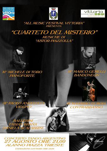 Ad esibirsi sarà il “CUARTETO DEL MISTERIO” ensemble formato da quattro grandissimi e affermati musicisti abruzzesi: Marco Gemelli al bandoneon, Paolo Angelucci al violino, Michele Di Toro al pianoforte e Massimo Di Moia al contrabbasso. Il Cuarteto del Misterio proporrà con proprie rielaborazioni e adattamenti le pagine più belle scritte da Astor Piazzolla, compositore argentino considerato uno dei più grandi dell’ultimo secolo, catapultando gli scoltatori nel mondo del cosiddetto “Nuevo Tango”, genere dalle caratteristiche spiccatamente latine per le melodie e per i ritmi che lo animano, ma meno vincolato dai canoni del tango tradizionale e quindi terreno fertile per improvvisazioni in chiave jazzistica.