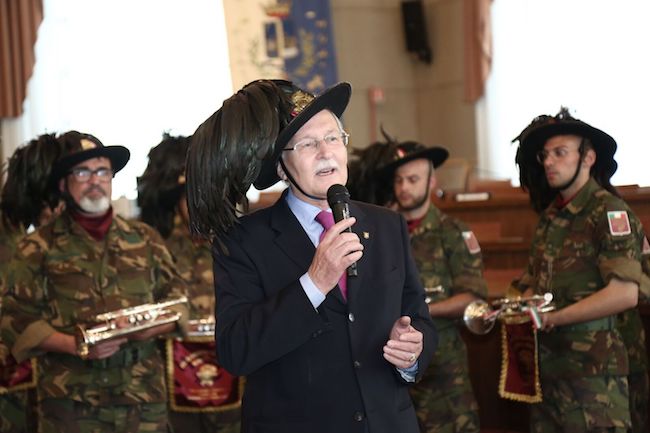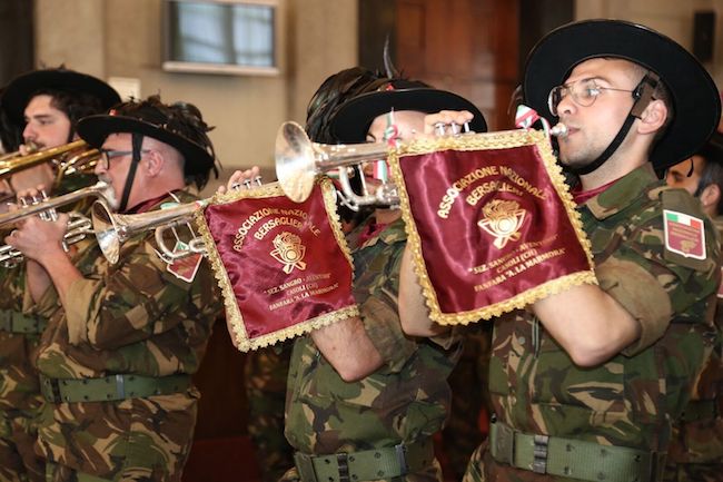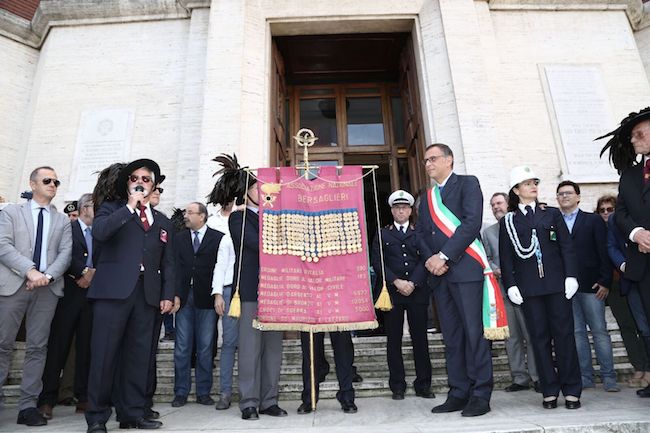 Ad accoglierlo il sindaco Marco Alessandrini con il Presidente dell’Associazione Nazionale Bersaglieri Daniele Carozzi, attorniati dal Prefetto, Questore, Presidente del Consiglio Comunale e tutte le autorità Civili e militari.
