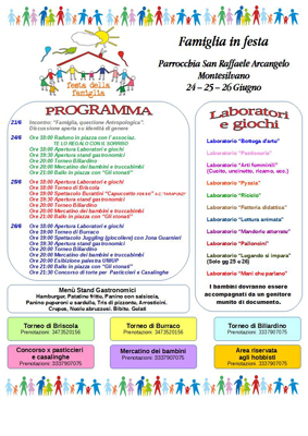 MONTESILVANO (PE) – Seconda edizione di “Famiglia in festa”, dal 24 al 26 giugno a Montesilvano: dopo il successo dello scorso anno, i volontari della Parrocchia San Raffaele Arcangelo ripropongono questa iniziativa pensata per riunire grandi e piccini all’insegna del divertimento.