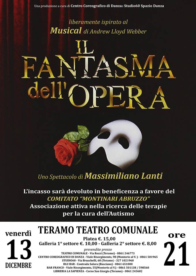 volto sfigurato che vive nei sotterranei dell’Opéra di Parigi per la giovane soprano Christine Daaé, legata sentimentalmente al visconte Raoul De Chagny. Lo spettacolo e le splendide musiche di Lloyd Webber rendono il Fantasma molto più che un amante tragico, un romantico sensibile e non solo una creatura intrisa di orrore e paura. A vestire i panni di Phantom sarà lo stesso maestro Massimiliano Lanti, affiancato da Valeria Ciampichetti nel ruolo della cantante lirica Christine, Debora D’Agostino (Firmin) e Federica Pardi (Andrè). Con loro, sul palco, circa 50 ballerini del Centro Coreografico di Danza di Montorio al Vomano e di Studio60 Spazio Danza Teramo. Le coreografie sono a cura di Massimiliano Lanti, Elsa Calisti e Annarita Di Censo.