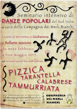 BELLANTE – Al via la nuova edizione dei corsi di danze popolari del Sud Italia organizzata dalla Compagnia dei Merli Bianchi. I seminari intensivi si terranno sia a Giulianova che a Bellante e prevedono lo studio delle tecniche fondamentali di tre dante tipiche meridionali: la pizzica, la tarantella calabrese e la tammurriata. Le lezioni partiranno il 26 febbraio a Giulianova e il 2 marzo a Bellante e si articoleranno in un incontro a settimana (il giovedì dalle 20 alle 21.00 presso la scuola “E. De Amicis” di Giulianova in via Cavour 4 e il lunedì dalle 19 alle 20.00 nella sede della Compagnia a Bellante Stazione in via Nazionale 8).
