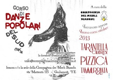GIULIANOVA – Danze popolari del Sud Italia: da quest’anno i corsi della Compagnia dei Merli Bianchi anche a Teramo dopo i laboratori già attivati a Giulianova e Montorio al Vomano.Il primo ciclo trimestrale di lezioni si terrà da ottobre a dicembre. Durante i corsi, i docenti della compagnia giuliese guideranno i partecipanti nello studio delle tecniche fondamentali della pizzica, della tammurriata e della tarantella calabrese.