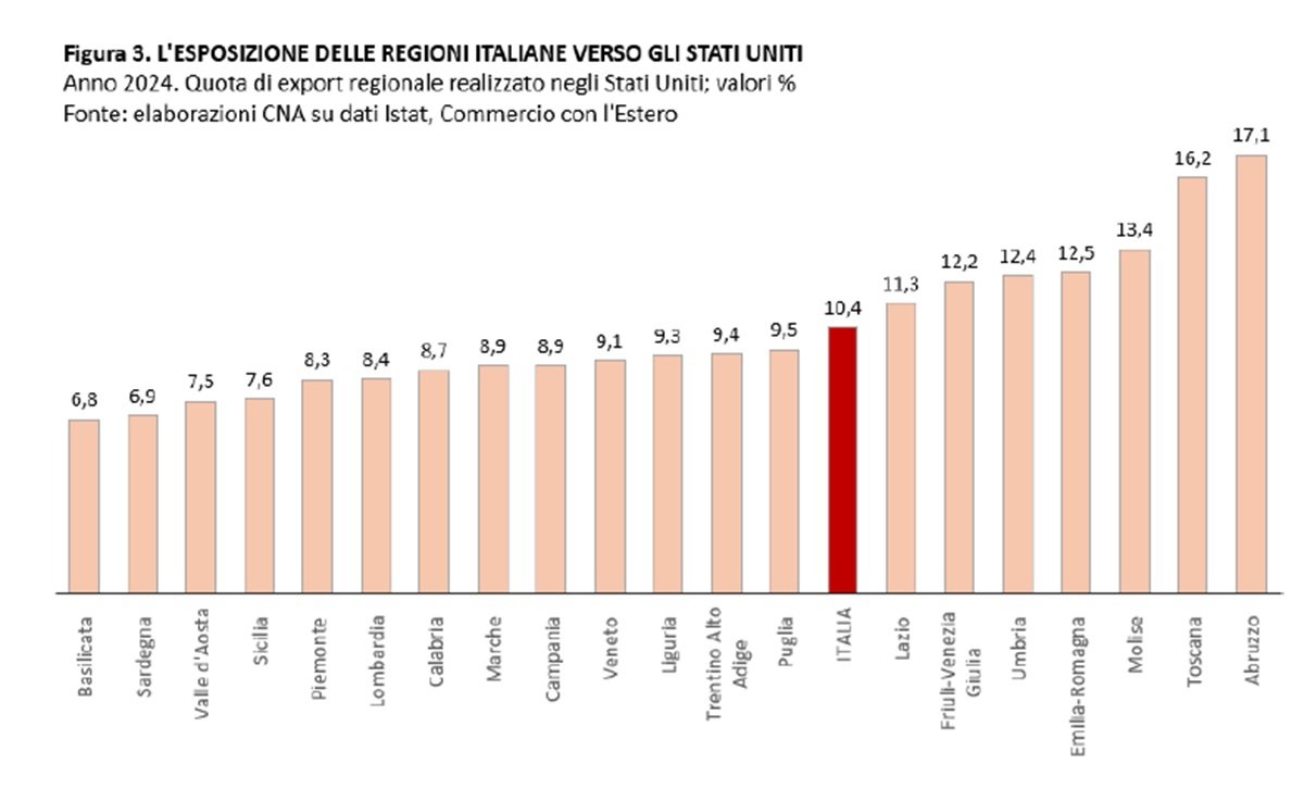 REGIONE – L’Abruzzo risulta la regione italiana più esposta ai dazi USA, con un impatto proporzionalmente superiore rispetto al resto del Paese. Secondo una recente analisi dell’Area Studi e Ricerche della CNA nazionale, il 17,1% dell’export abruzzese è diretto verso gli Stati Uniti: una quota che vale oltre 1,6 miliardi di euro e che rappresenta la percentuale più alta d’Italia.