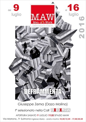 SULMONA (AQ) – Sabato 9 luglio alle ore 19 presso lo Spazio MAW a Sulmona (AQ), mostra di Giuseppe Zema (Dazo Molino), autore dell’opera risultata prima tra i 10 finalisti votati dalla giuria della call 10X10XMAW-Sfida (giocosa) al sistema dell’arte.